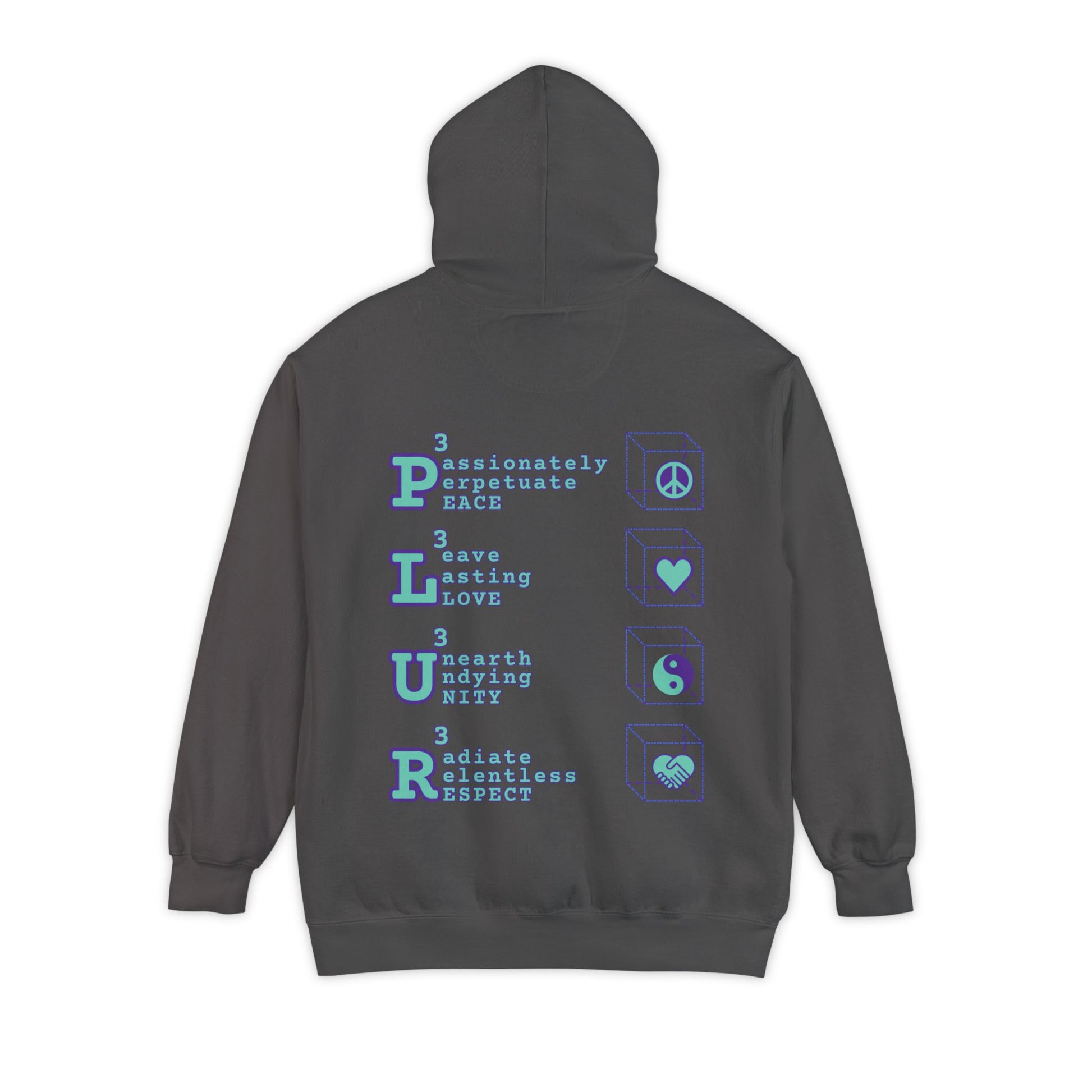 This hoodie puts the PLUR³ cube front and center with a big chest graphic, and prints the full acronym down the back – four specific calls to action: Passionately Perpetuate Peace, Leave Lasting Love, Unearth Undying Unity, Radiate Relentless Respect. Instead of vague vibes, you’re wrapped in a checklist.